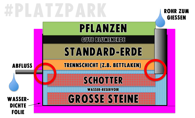 - nicht maßstabsgerecht – die Drainage-Schicht nimmt nur etwa ein Viertel der Höhe ein, der Rest ist Erde