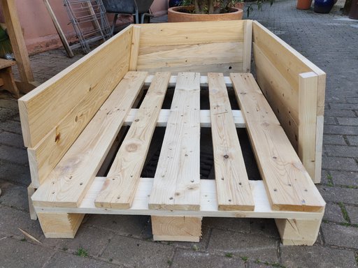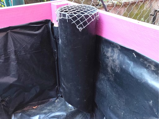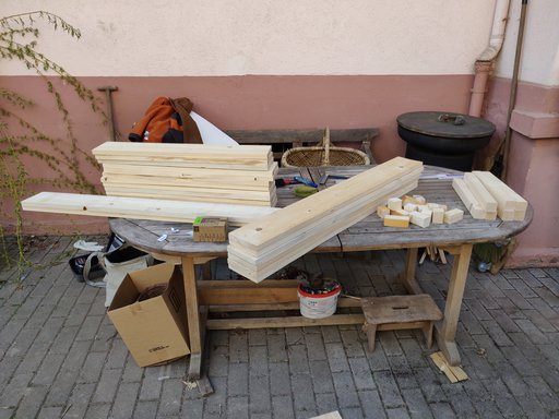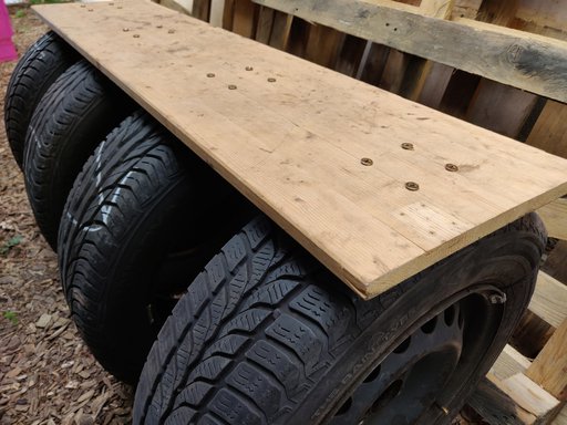 - Fahrradständer in Form von Autoreifen wurden von der Kasteninnenseite aus angeschraubt, bevor die Erde reinkam und sind unten über ein stabilisierendes Brett verbunden