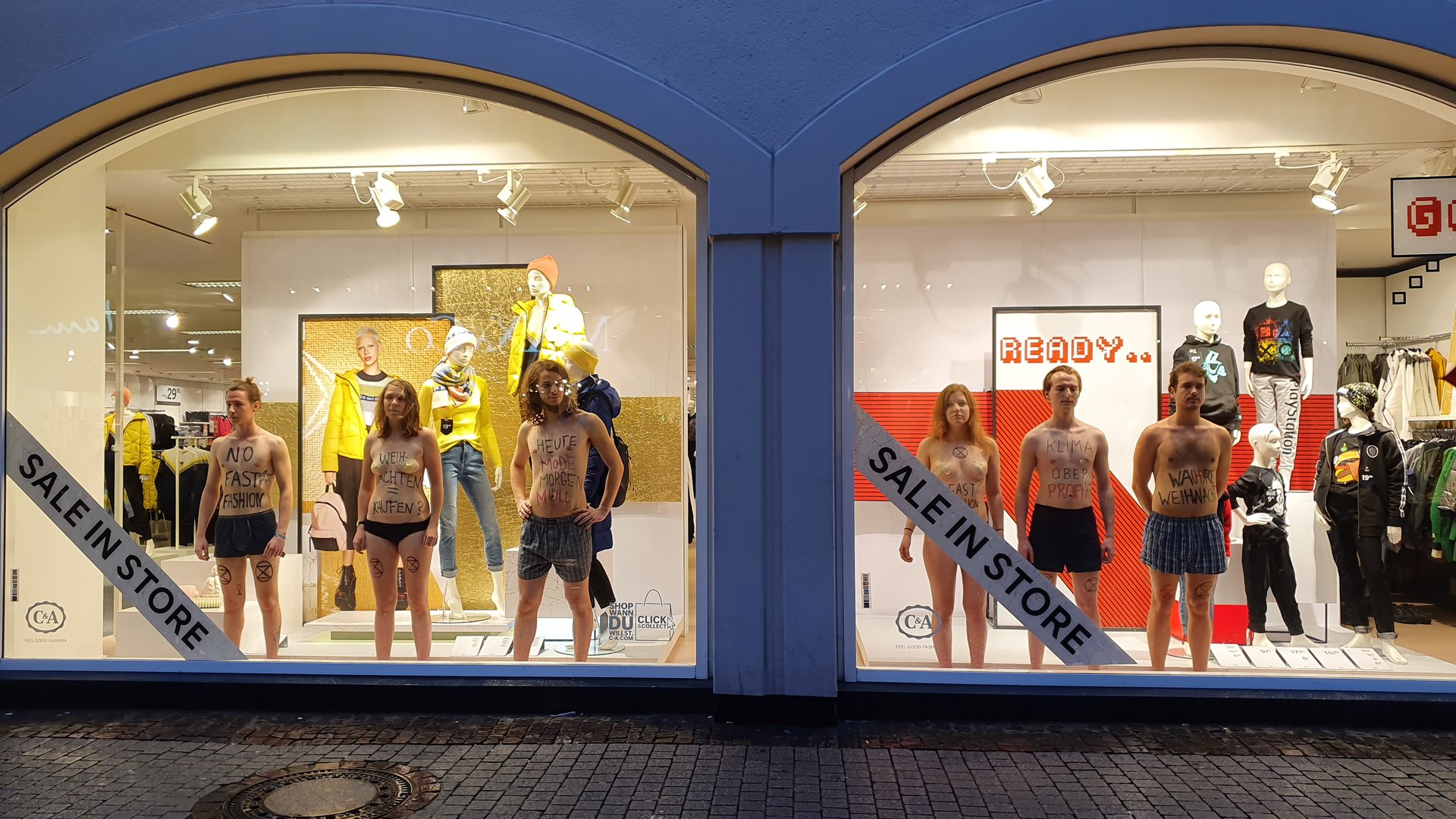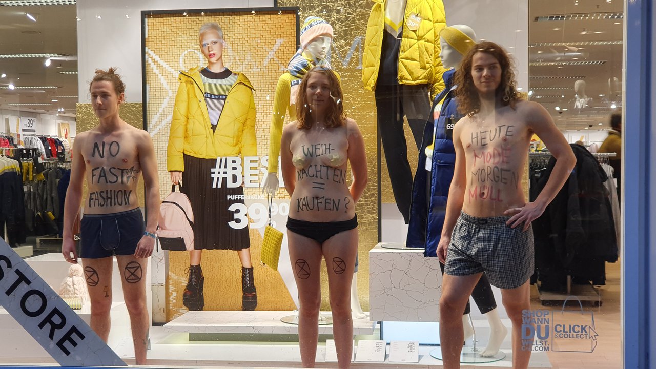 Einige Rebell:innen protestierten dabei halbnackt im Schaufenster eines Modegeschäfts in der Heidelberger Hauptstraße, um auf die klimaschädlichen Folgen unserer Überflussgesellschaft aufmerksam zu machen.