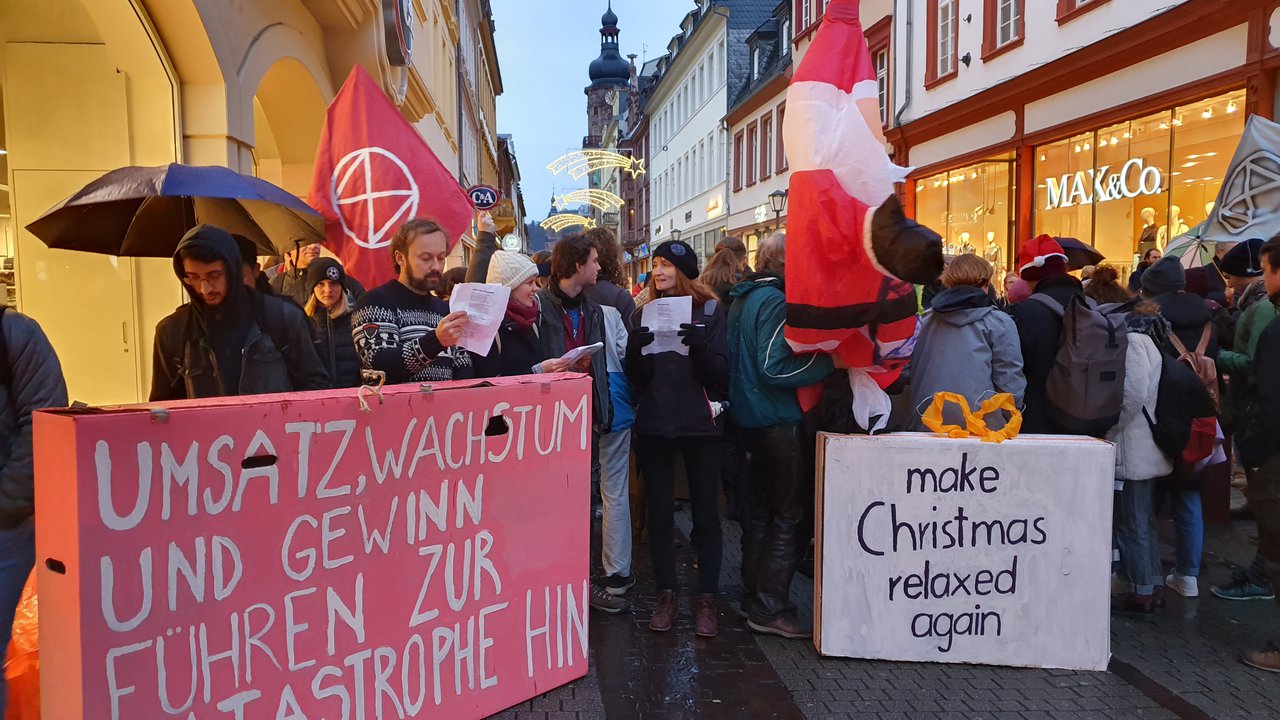 Wir protestierten in der Heidelberger Hauptstraße gegen weihnachtlichen Konsumwahn und Fast Fashion.
