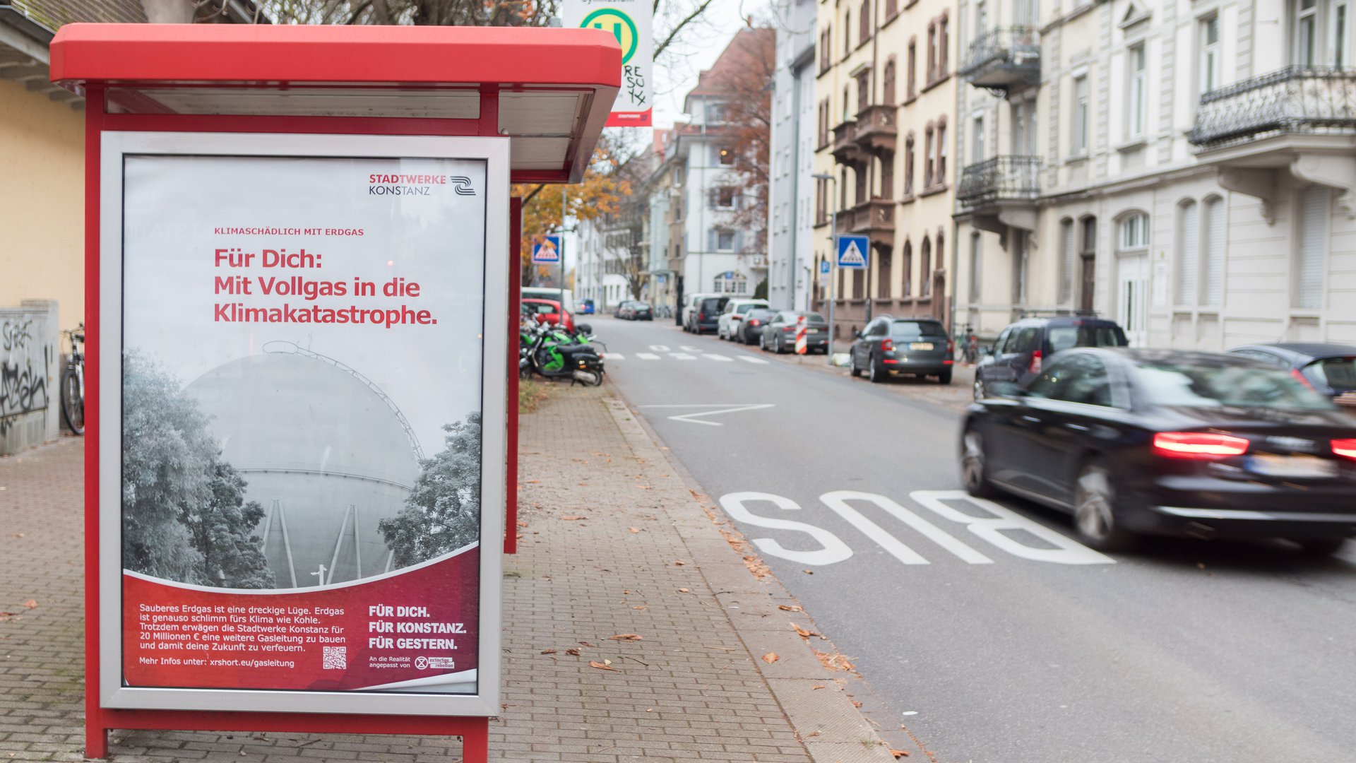 Erdgas ist genauso schlimm fürs Klima wie Kohle. Trotzdem erwägen die Stadtwerke Konstanz für 20 Millionen € eine weitere Gasleitung zu bauen und damit deine Zukunft zu verfeuern. Deshalb haben wir die Plakatwerbung der Stadtwerke Konstanz um ein Motiv zum Thema Erdgas erweitert, auf dem es erlicherweise heißt: "Für dich: Mit Vollgas in die Klimakrise." Mehr
