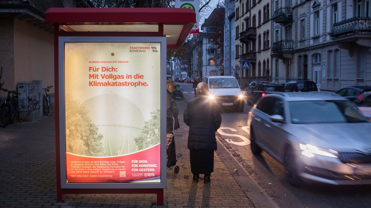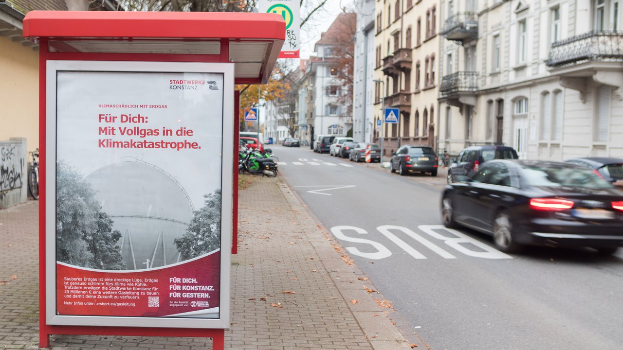 Konstanzer Klimaaktivist:innen haben die Plakatwerbung der Stadtwerke Konstanz um ein Motiv zum Thema Erdgas erweitert, auf dem es heißt: "Für dich: Mit Vollgas in die Klimakatastrophe." Die großformatigen Plakate sind an Bushaltestellen im Konstanzer Stadtgebiet aufgetaucht.