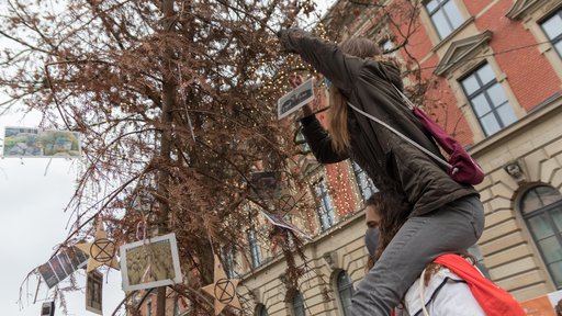 Im Zuge der Klimakrise und anderer ökologischer Katastrophen stehen auch lieb gewonnene Traditionen wie besinnliche Weihnachten auf dem Spiel. Konsumrausch, Müllberge und der Weihnachtsbraten aus Massentierhaltung z. B. müssen kritisch hinterfragt werden. Der Weihnachtsbaum steht dieses Jahr Kopf und sieht vertrocknet aus.