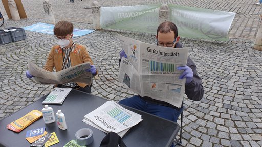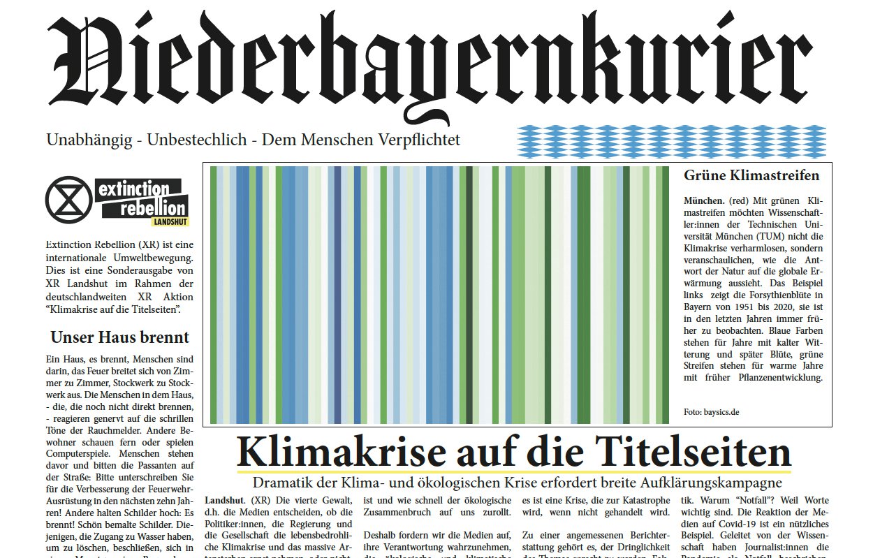 Im Rahmen der deutschlandweiten dezentralen Aktion "Klimakrise auf die Titelseiten" haben wir in Landshut einfach selbst eine Zeitung gedruckt. Ähnlichkeiten mit anderen Tageszeitungen sind nach diversen Änderungen mittlerweile ausgeschlossen. Inhaltlich haben wir sowieso ein Alleinstellungsmerkmal, weil wir die Klimakrise und das Artensterben in der Ausführlichkeit und Dringlichkeit behandeln, wie wir das auch von den uns optisch nicht mehr so ähnlichen Tageszeitungen und Zeitschriften wünschen würden.