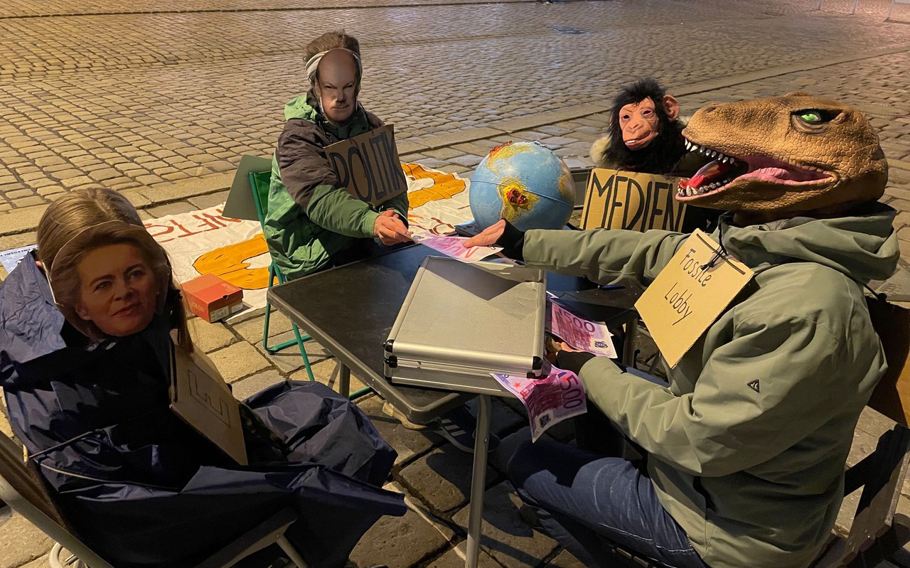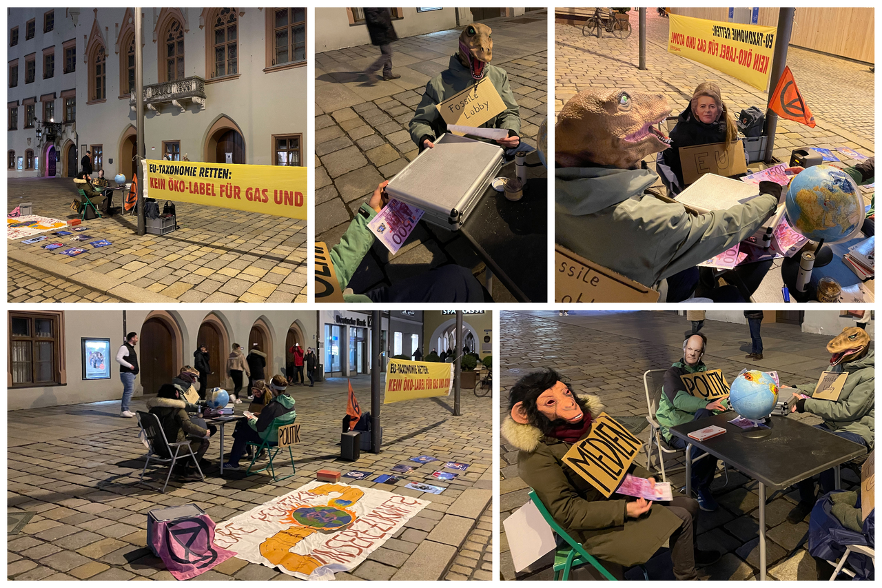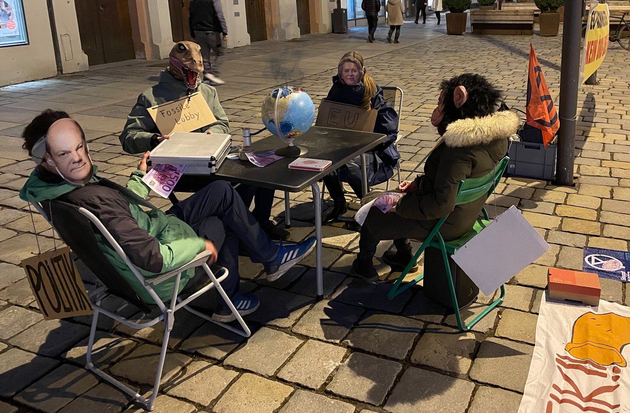 In ihrer Rede schildern die Umweltaktivisten, dass Atomkraft und Gas die Voraussetzungen für die Aufnahme in die EU-Taxonomie in keinster Weise erfüllen und dass dies in der Wissenschaft unumstritten sei. Ihrer Meinung nach haben die französische Atomlobby und deutsche Gas-Lobby hier ganze Arbeit geleistet. Im Aktionsbild, das die Aktivisten inszenieren, sitzen auch Vertreter deutscher Regierungsparteien mit fossilen Lobbyisten und der EU gemeinsam am Tisch und ignorieren den brennenden Planeten und die Folgen ihres Handelns. Geldkoffer wechseln den Besitzer.
