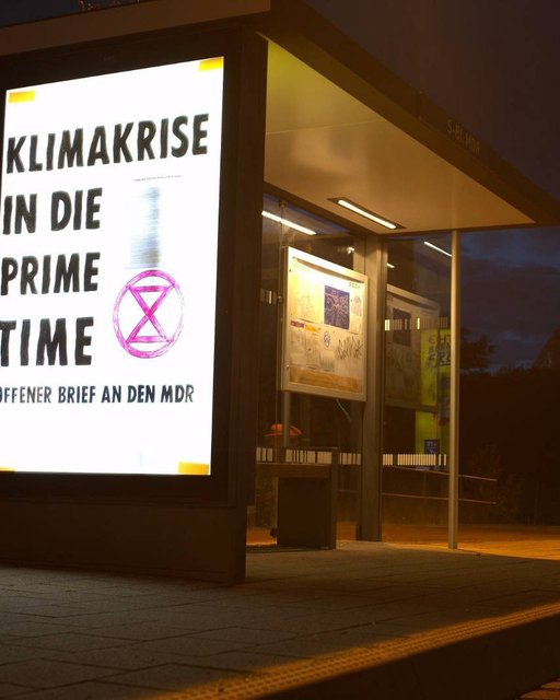 Nachdem nachts zuvor die Haltestellen Werbung für unser Anliegen gemacht hatten, forderten wir den Mitteldeutschen Rundfunk vor Ort auf, die Klimakrise ihrer Wichtigkeit entsprechend auf seinen Kanälen abzubilden.
