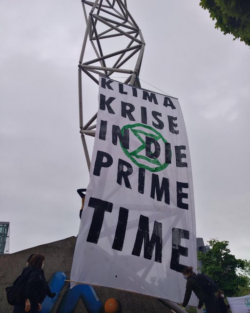 Mit mehreren Bannern, unter anderem befestigt an der Stahlkonstruktion vor der "Media City Leipzig", und fast 50 Menschen aus dem Ostbündnis von XR setzten wir ein starkes Zeichen: