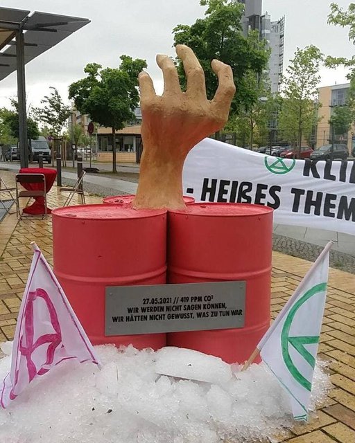 Zunächst besuchte uns eine Redakteurin der Nachrichtensendung mdr aktuell, um mehr über unsere Beweggründe zu erfahren. Dann versuchten wir die Intendantin Karola Wille zu erreichen, um zusammen mit ihr unser Denkmal zu enthüllen. Gegen Mittag kam schließlich eine Pressesprecherin des MDR zu unserer Aktion, der wir die Skulptur feierlich "überreichten". Das Denkmal zeigt eine Hand, die wie ertrinkend aus einem Sockel aus Ölfässern ragt, umgeben von einem Eishaufen. Auf dem Sockel ist eine Aufschrift angebracht, die sich mit dem folgenden Text an den MDR richtet: