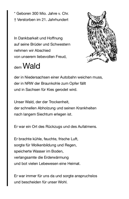Wälder haben das Potential, die Klimakrise abzupuffern, und um weitere Emissionen zu vermeiden, ist jeder einzelne Baum wichtig. Doch sollten wir Wälder als Orte der biologischen Vielfalt, Lebensräume und Erholung nicht einzig auf ihre Fähigkeit der Emissionsreduktion reduzieren und diese auch nicht einzig auf Wälder abwälzen. Der Haupttreiber der Klimakrise ist immer noch der Kapitalismus, welcher die Ausbeutung und Zerstörung unserer natürlichen Lebensgrundlagen erst profitabel macht. Dadurch kratzen jegliche Versuche, den Waldverlust innerhalb des bestehenden Systems aufzuhalten, nur an der Oberfläche oder täuschen über die weiterhin stattfindende Zerstörung hinweg. So haben beispielsweise Recherchen gezeigt, dass das FSC-Siegel keine Garantie für nachhaltige Waldbewirtschaftung ist, sondern ähnlich des MSC-Siegels beim Fischfang eher eine Beruhigungspille für den Verbraucher, da keine effektive Kontrolle der Richtlinien möglich ist. Und der kürzlich beschlossene REDD+ Mechanismus, der armen Ländern finanzielle Anreize für den Waldschutz bietet, wälzt die Verantwortung auf diese ab, während die Hauptverursacher ihre eigenen Klimaziele zurückschrauben. Wir müssen aufhören, den Wald nur als Produktionsfläche zu sehen, die es zu bewirtschaften gilt, brauchen eine naturnahe Waldbewirtschaftung und außerdem einen Systemwandel, um den Waldverlust aufzuhalten.