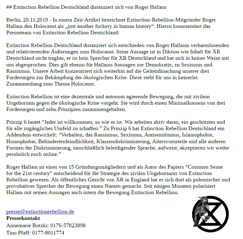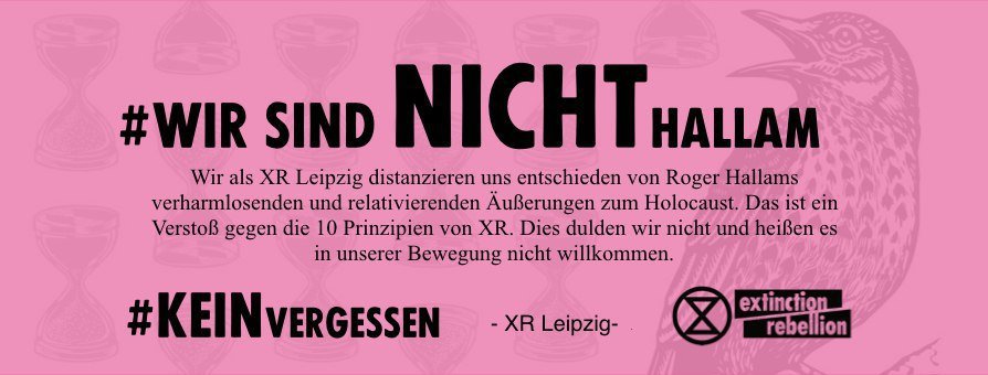 Wir als XR Leipzig distanzieren uns ebenfalls entschieden von Roger Hallams verharmlosenden und relativierenden Äußerungen zum Holocaust. Dies gilt ebenso für Hallams Aussagen zur Demokratie, zu Sexismus und Rassismus.