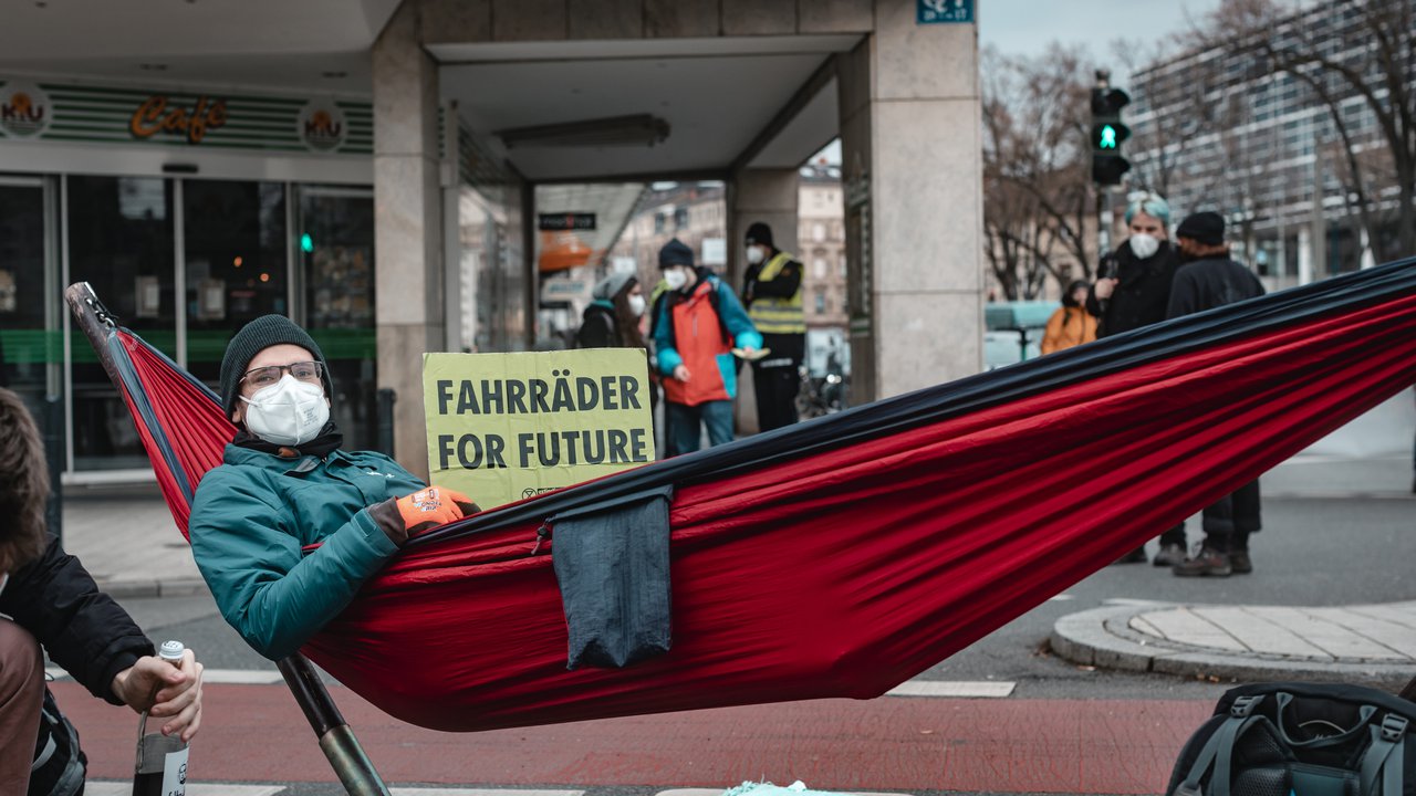 Am 11.12.21 blockierten wir zum dritten Mal mitten in der Mannheimer Innenstadt. Denn wir fordern weiterhin: Es ist Zeit für ausgebauten & kostenlosen ÖPNV und autofreie Innenstädte! „Die Klimakatastrophe bedroht unsere absoluten Lebensgrundlagen und damit wir es noch schaffen, müssen wir dringend auch die Verkehrswende starten”, meint Sprecherin Pia dazu. „Ein kostenloser und verbesserter ÖPNV ist dabei genauso wichtig wie eine autofreie Innenstadt.”