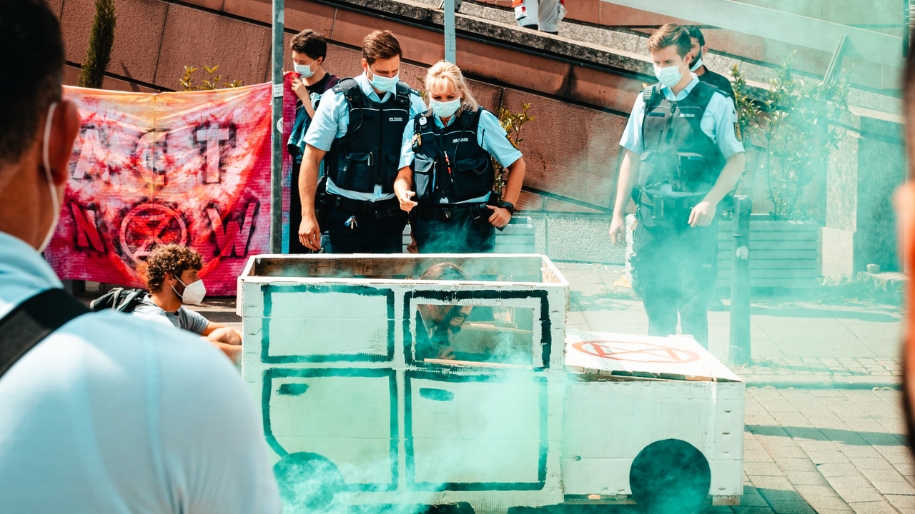 Dabei erwischte ihn jedoch die Polizei, welche ihn schon seit längerem wegen massiver Umwelt- und Klimazerstörung suchte und ihn auf der Blockade samt seines SUVs verhaftete.