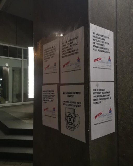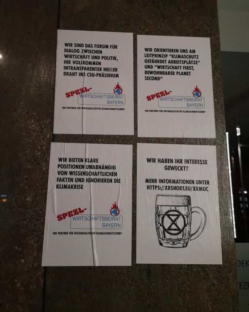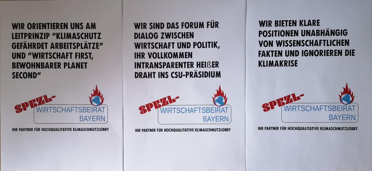 Heute sind vor dem Spezl-Wirtschaftsbeirat Bayern Werbeplakate aufgetaucht, die die hochqualitative #Klimaschmutzlobby-Arbeit anpreisen.