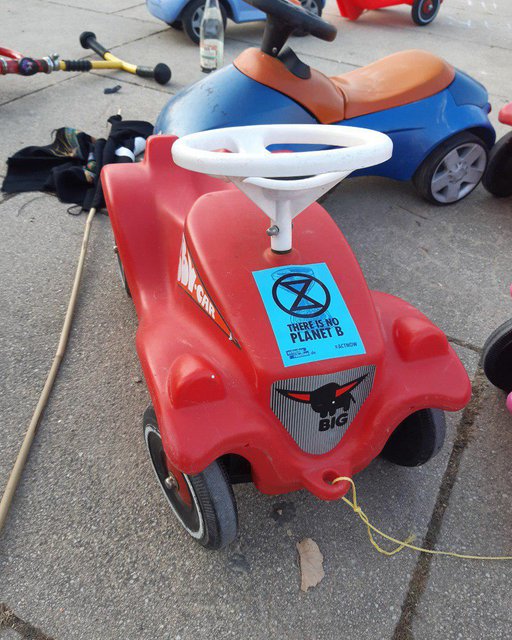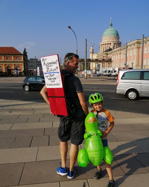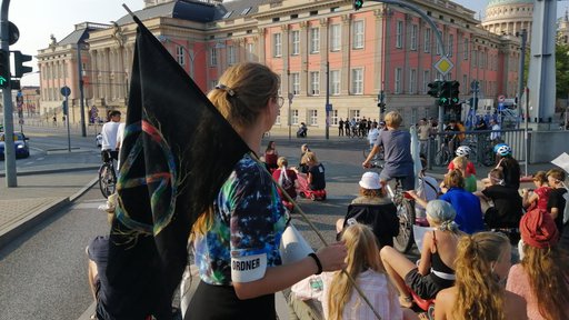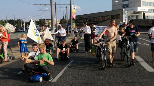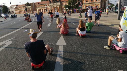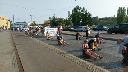 Ausgerüstet mit Bobby-Cars, Fahnen, ein paar schicken Kleidern und unser Banner: "Mit dem Leben spielt man nicht!", rollten wir die Lange Brücke herunter.