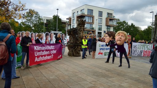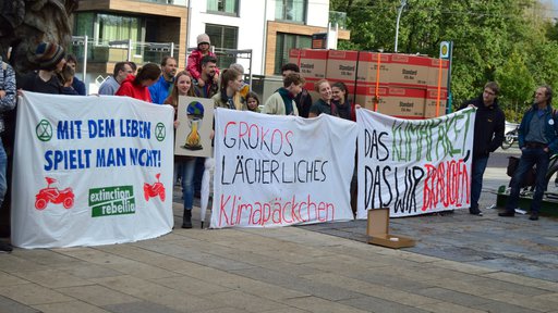Wie auf den Transparenten zu lesen: "GroKos lächerliches Klimapäckchen", ein kleiner Karton auf dem Boden und daneben zwei Meter hoch: "Das Klimapaket, das wir brauchen!"