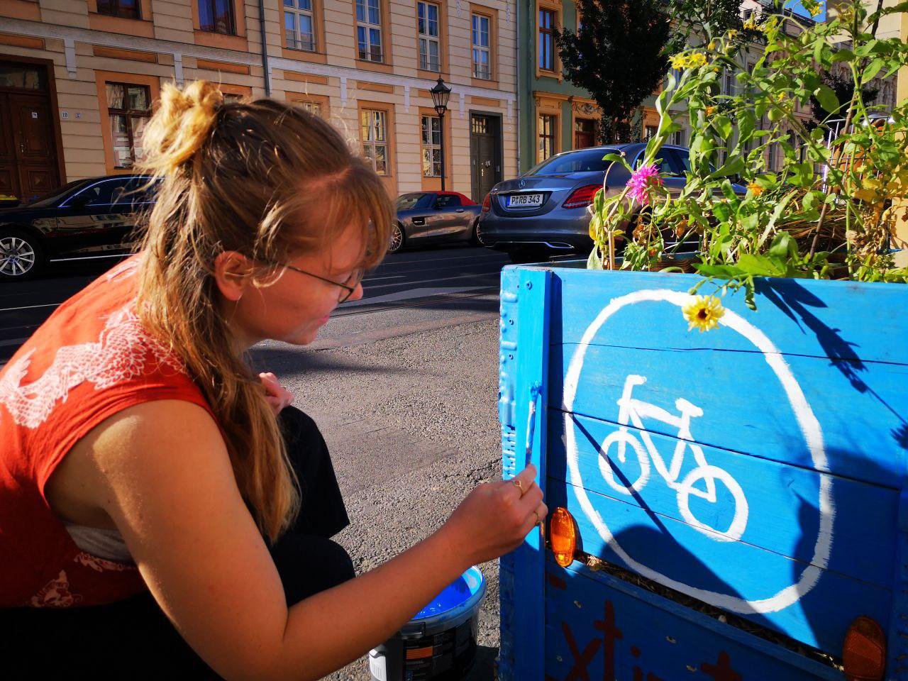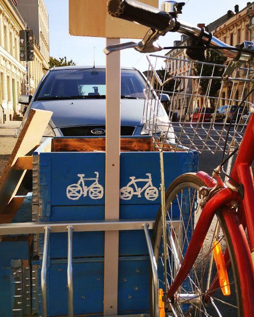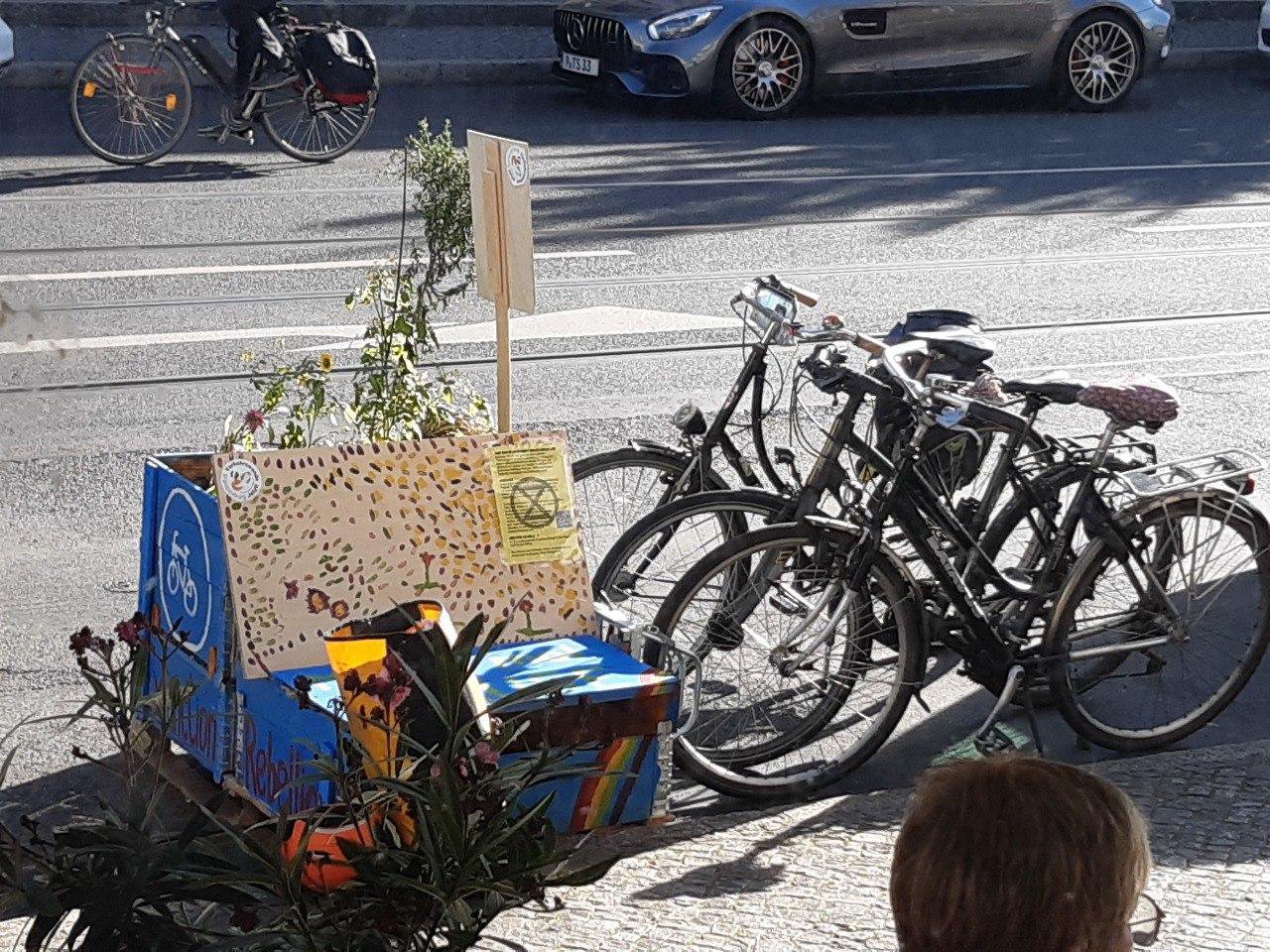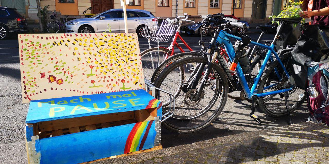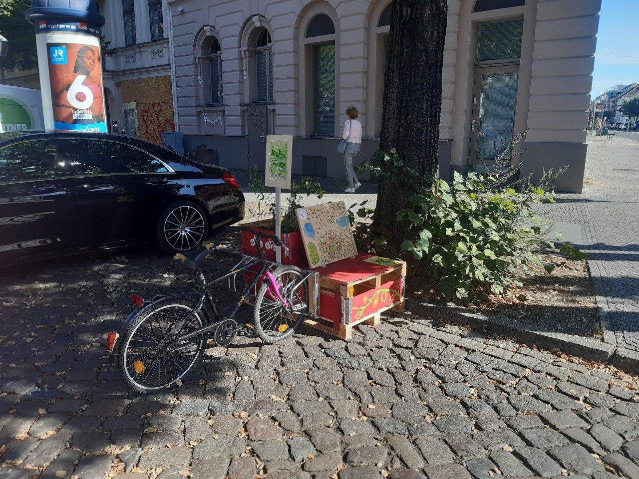 Wir haben anlässlich des Parking Days zwei Parkplätze in Hochbeete mit Sitzgelegenheit und Fahrradständern verwandelt.