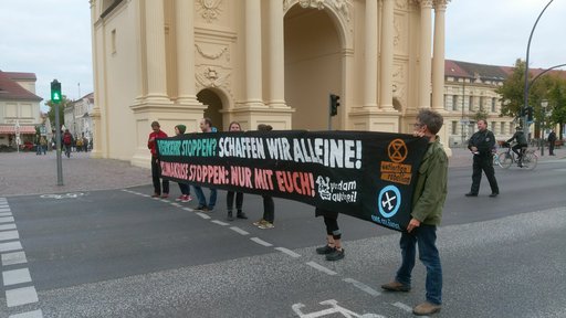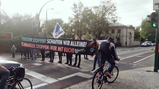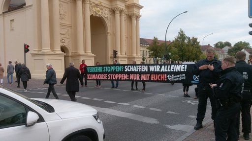 Gemeinsam mit Ende Gelände Potsdam und Potsdam Autofrei blockierten wir kurzzeitig den Autoverkehr an mehreren Stellen. Die wartenden Autofahrer versorgten wir mit Äpfeln, Keksen und Flyermaterial.