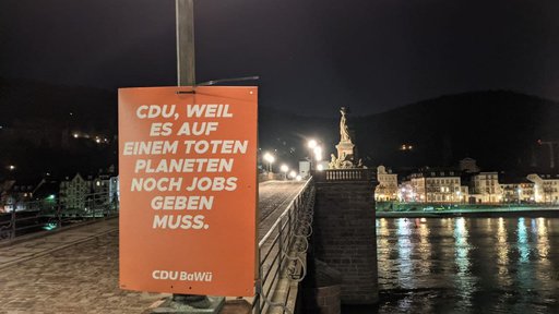 Hey CDU! Zu euren Wahlplakaten gab's ganz schön viel Spott, aber wir finden, dass die Inhalte sowieso nicht zu euch passen. Deswegen waren wir mal so frei und haben in Heidelberg, Stuttgart, Freiburg, Ulm, Konstanz und Karlsruhe ehrliche Wahlplakate für euch aufgehangen.