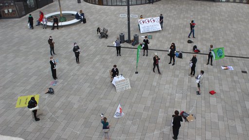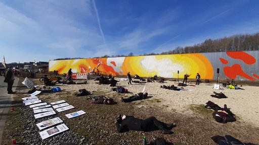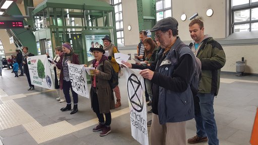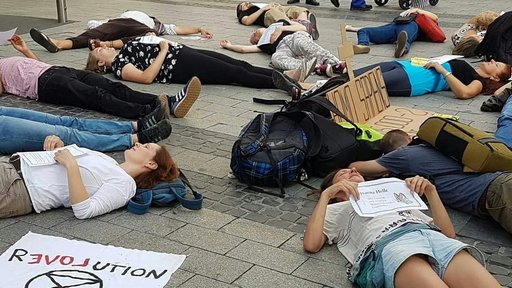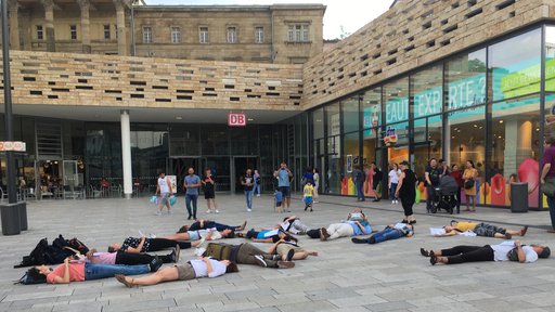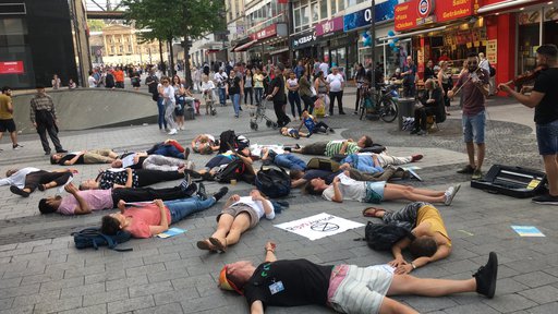 Circa drei Minuten dauerte das Schauspiel, dann erschien das Sicherheitspersonal und forderte die Rebell*innen auf, das Center zu verlassen. Vor den Toren der Arcaden ging die Aktion in die nächste Runde. Die Aktivist*innen inszenierten einen sogenannten Die-In, ein symbolisches Sterben für die gefährdete Zukunft unserer Kinder und Enkel.