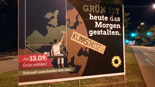 In der Nacht von Sonntag (6.9.2020) auf Montag haben Aktivist*innen von Extinction Rebellion einige Wahlplakate auf der B7 am Robert-Daum-Platz dekoriert.