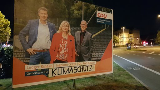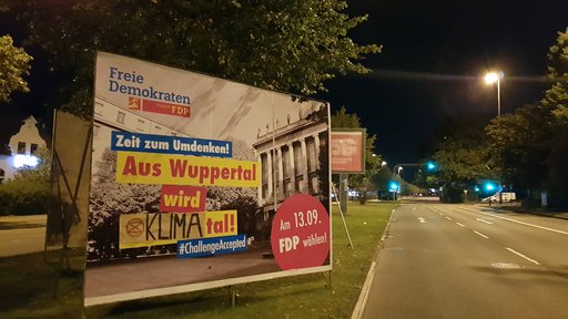 „Wuppertal wird Klimatal“ titelt nun die FDP. Die CDU steht „Gemeinsam für Klimaschutz“ und Andreas Mucke für „Klimanotstand“. Diese und andere Klimaschutzversprechen zeigen die großen Stellwände auf dem Grünstreifen, der Nord- und Südstadt teilt.