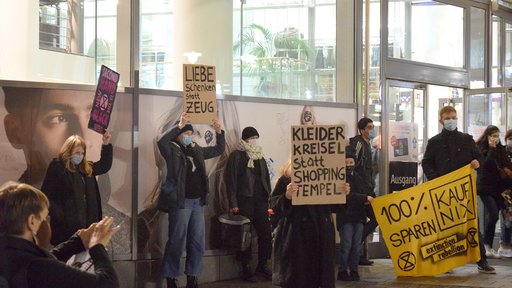 Am 27.11.2020 hat Extinction Rebellion den Black Friday in Wuppertal zum Block Friday gemacht. Circa 35 Rebell*innen aus Wuppertal und Umgebung sind mit Bannern, Schildern und Flyern durch die City Arcaden gezogen, um auf die tödlichen Auswirkungen unseres kapitalistischen Systems aufmerksam zu machen. Menschen mit Plakaten in den Händen fuhren die Rolltreppen hoch und runter.
