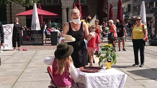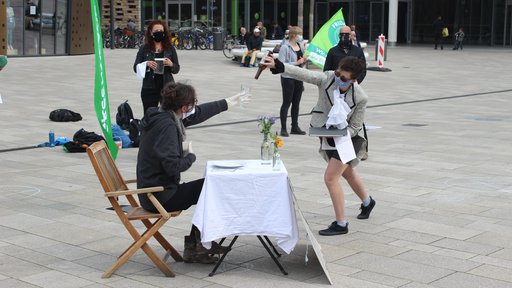 Am Sonntag, den 3. Mai wurden die Passant:innen vor dem Wuppertaler Hauptbahnhof mit einer ungewöhnlichen Performance überrascht. Wir machten gemeinsam mit Aktivist:innen von Fridays for Future und Greenpeace auf den German Overshoot Day aufmerksam. Im Fokus der Aktion befand sich ein gedeckter Tisch, an dem eine Person saß und lautstark „Mehr! Gebt mir mehr!“ forderte. Im Kreis um den Tisch herum waren weitere, als Kellner:innen verkleidete, Aktivist:innen mit Gefäßen in den Händen positioniert. Auf leeren Töpfen, Schüsseln und Flaschen stand geschrieben, welche Ressourcen für diese Jahr nicht mehr verfügbar sind. Von Trinkwasser, über Erdöl und Phosphor war einiges dabei.
