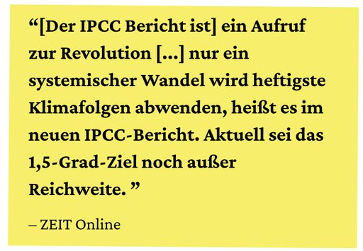 1.5°C sind weder etwas Gutes, noch zu halten und die Klimakatastrophe trifft uns: alle, heute, überall, wenn auch unterschiedlich. Lösungen sind vorhanden, sind günstiger als die Folgen und schaffen nebenbei noch eine gerechtere, grünere Welt. Aber keiner der politischen Pläne hält wissenschaftlich kritische Grenzen ein.
