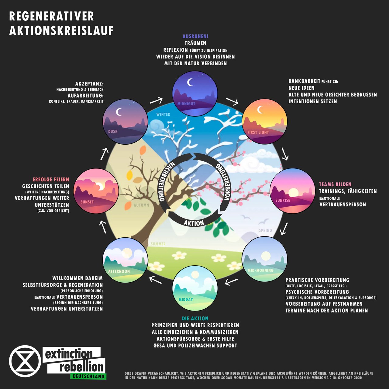 Dieses Modell veranschaulicht, wie wir natürliche Zyklen nutzen können, um persönliches, gemeinschaftliches und globales Wohlbefinden zu fördern und wie wir nach dem Vorbild der Natur im Wechselspiel zwischen Aktivität und Ruhe neue Kraft schöpfen können. Es wurde von XR UK basierend auf dem 8-Schilde-Modell entwickelt.